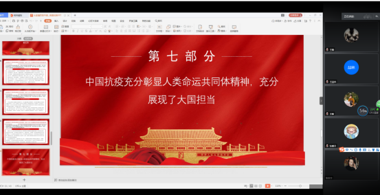 中国制度,优势显著。下午2点,以腾讯会议为宣讲平台,学院党总支书记庞守荣以《从疫情防控中感悟中国特色社会主义制度优势》为主题,通过对中西方战“疫”实例的对比,将中国抗疫过程中党中央统一部署、集中统一领导、以人民为中心、密切联系群众、社会主义制度集中力量办大事、党对军队的绝对领导、社会主义制度不断自我完善等显著优势进行了充分彰显。