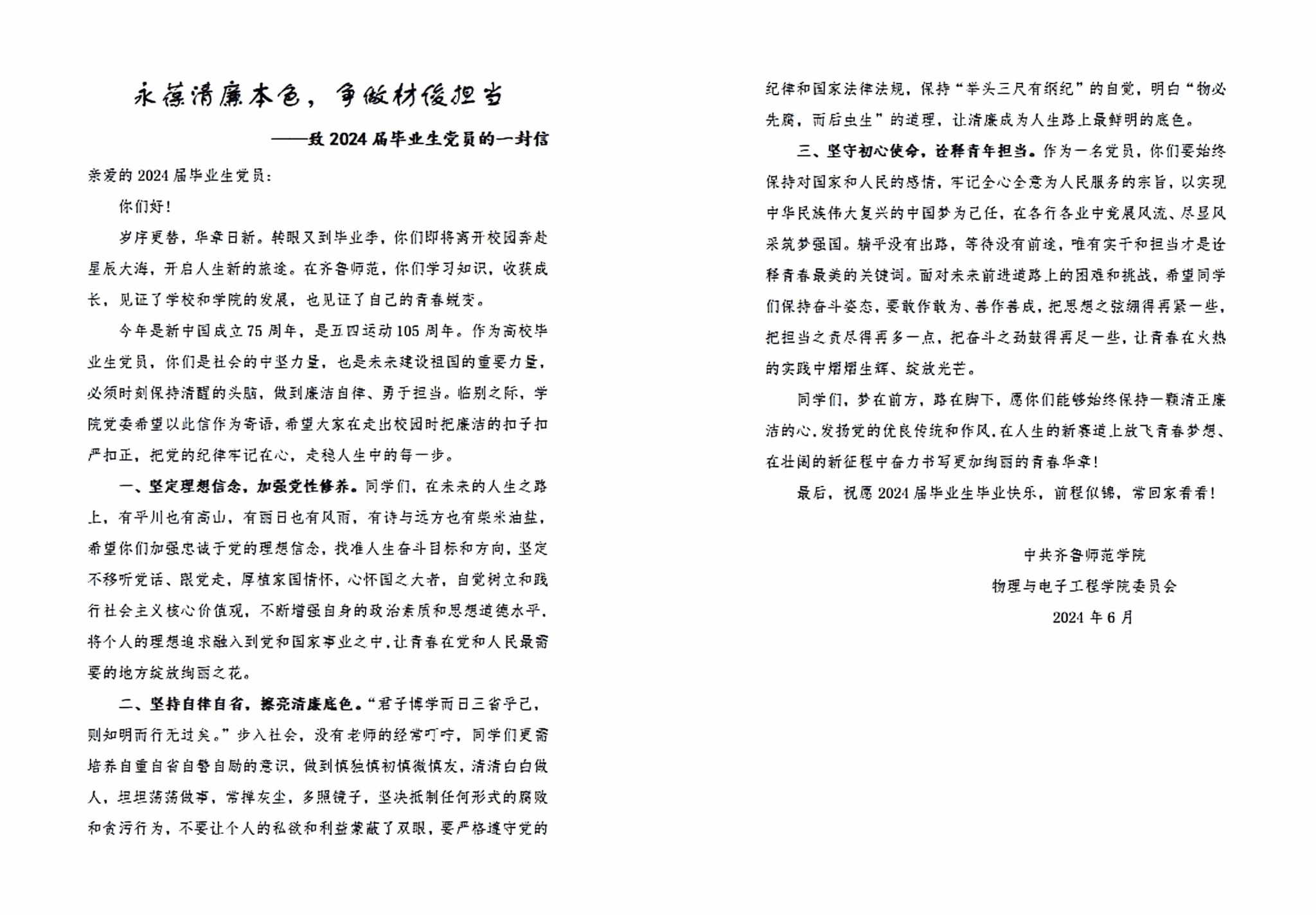 今后,物理与电子工程学院将以“上好最后一堂党课”为抓手持续加强毕业生党员思政教育。通过最后一次党课,强化毕业生党员的党性意识、宗旨意识和服务意识,引导和激励毕业生党员自觉加强政治理论学习和党性修养,在将来的工作岗位上发挥模范带头作用。