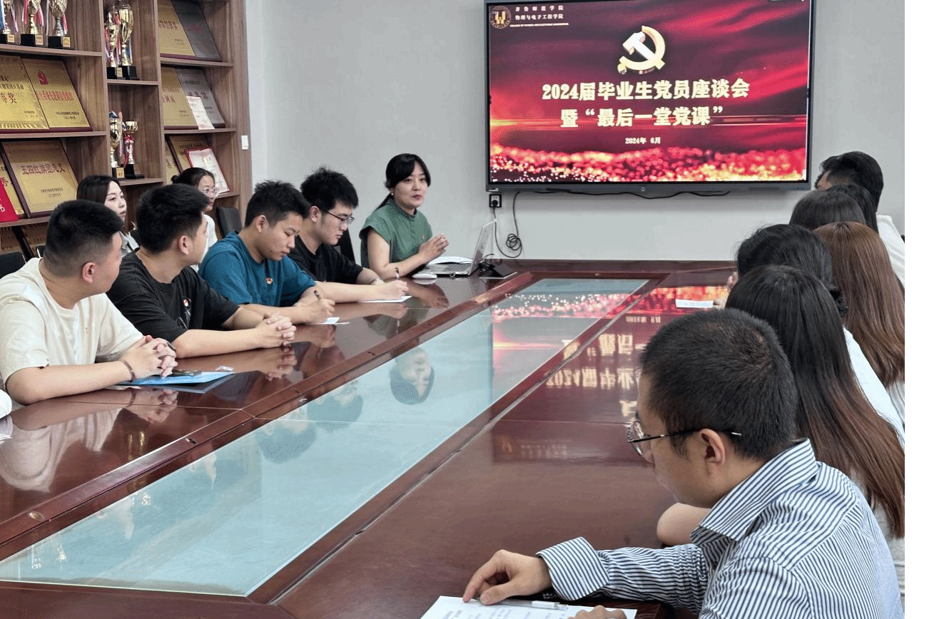 6月21日,物理与电子工程学院在二号实验楼216会议室举办2024届毕业生党员座谈会暨“最后一堂党课”活动。学院党委书记臧葳、副书记周凯出席会议,学院辅导员及全体毕业生党员参加活动。