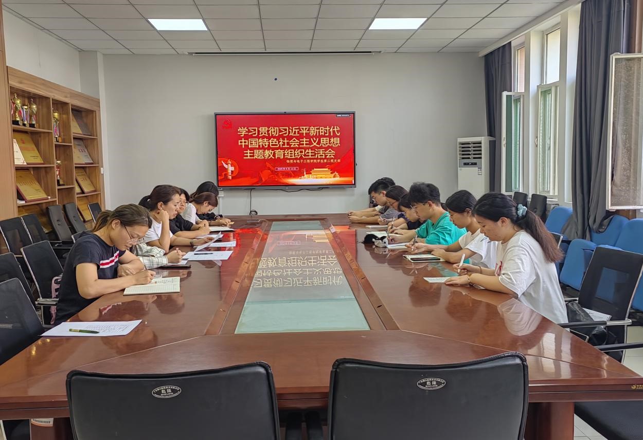近期,物理与电子工程学院学生党支部以及教师党支部在二号实验楼B216会议室召开学习贯彻习近平新时代中国特色社会主义思想主题教育专题组织生活会。学生第一、第二党支部以及教师党支部书记张萌、梅茹、杨在发分别主持会议。