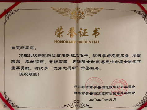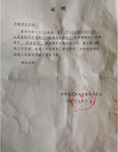 近日,我院曹雯琪同学收到了泰安市一社区颁发的“优秀志愿者”证书。新冠病毒疫情暴发后,她积极到抗疫一线参与志愿服务活动,在社区疫情防控卡点值班,协助社区开展宣传动员、值班值守、文明劝导等工作。与此同时,在临沂市沂水县,她的同班同学田雍涛也在积极践行一名青年大学生的担当与使命。