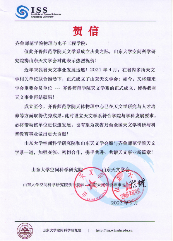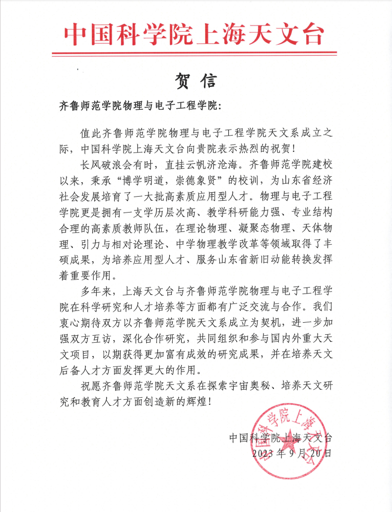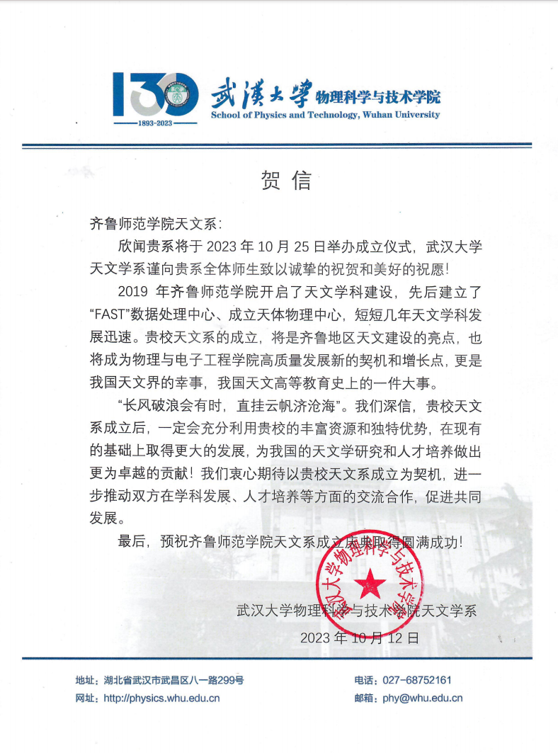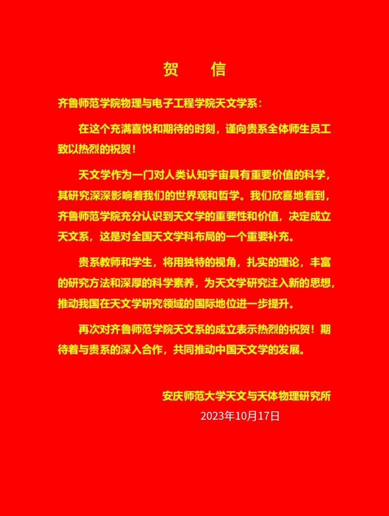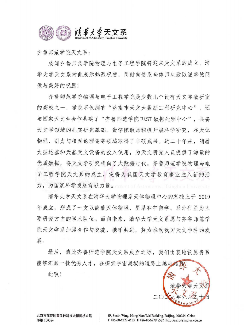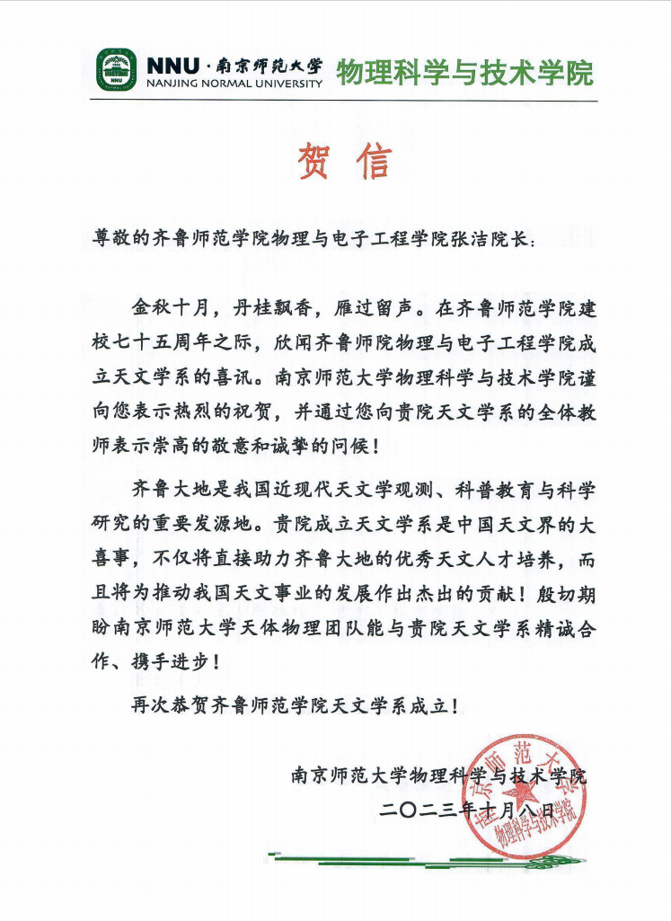 丹桂飘香秋意浓,金秋时节硕果丰。在齐鲁师范学院物理与电子工程学院天文系成立之际,清华大学天文系等11所友好兄弟院校纷纷发来贺信表示祝贺。信中文字语挚情长,不仅传达着对我校成立天文系的热切期盼与诚挚祝福,也对我校75年来所取得的办学成就给予了高度评价,并对我校未来的发展表达了美好的祝愿。下面让我们一起来看看,各兄弟院校的祝福吧!