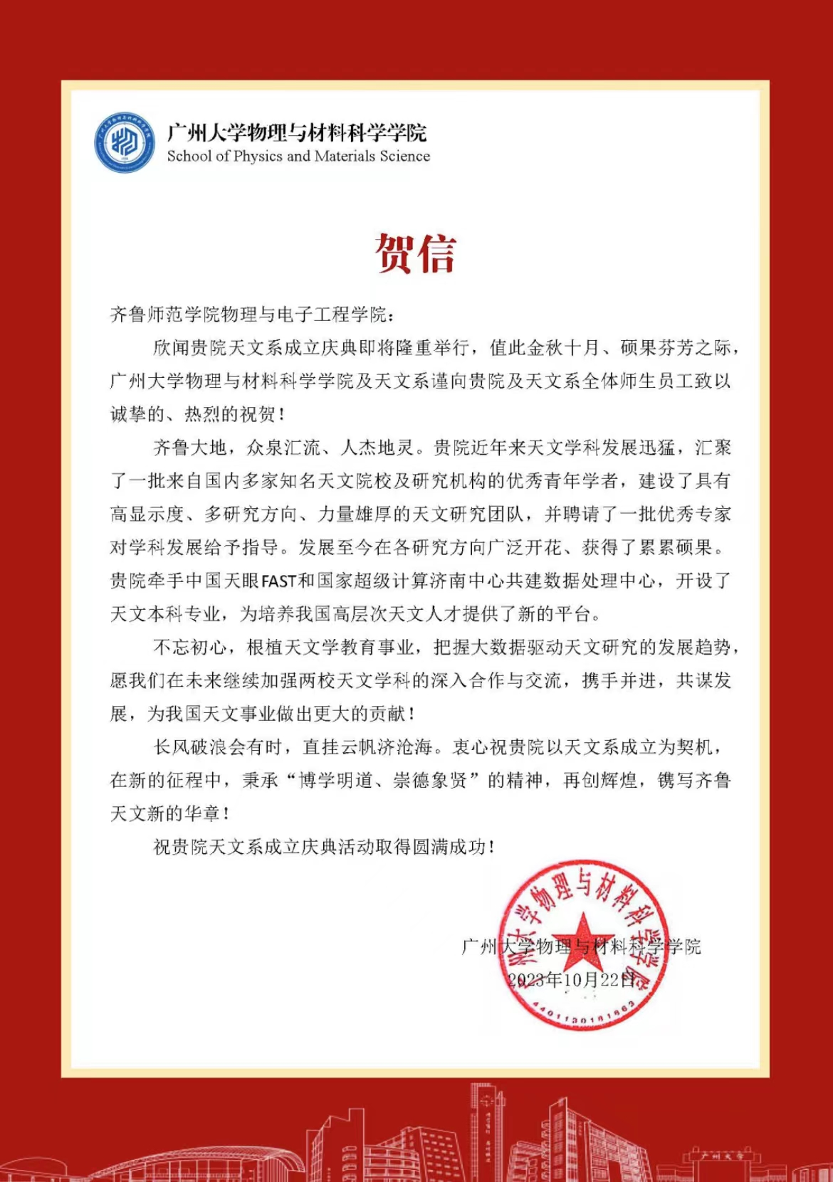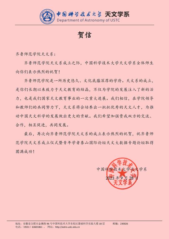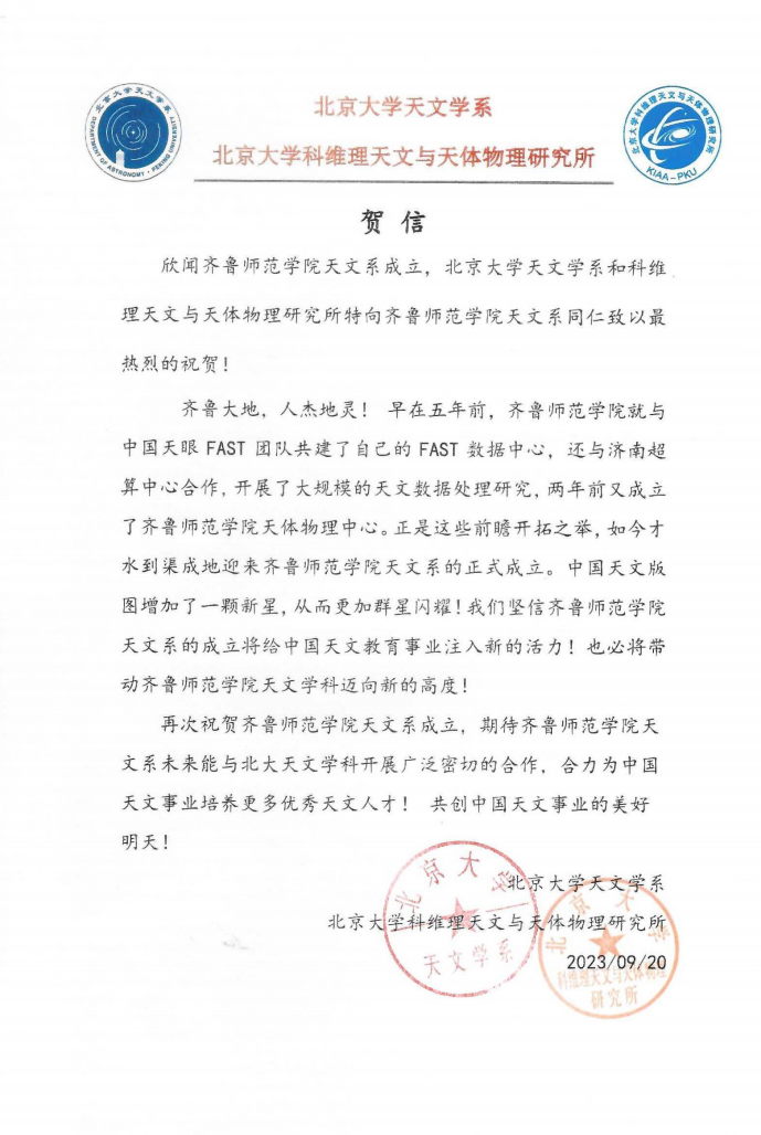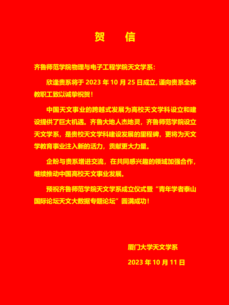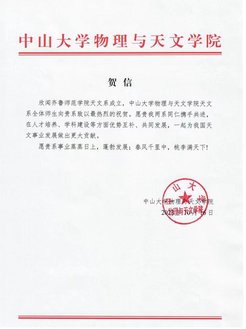 丹桂飘香秋意浓,金秋时节硕果丰。在齐鲁师范学院物理与电子工程学院天文系成立之际,清华大学天文系等11所友好兄弟院校纷纷发来贺信表示祝贺。信中文字语挚情长,不仅传达着对我校成立天文系的热切期盼与诚挚祝福,也对我校75年来所取得的办学成就给予了高度评价,并对我校未来的发展表达了美好的祝愿。下面让我们一起来看看,各兄弟院校的祝福吧!