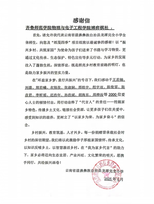 为了关爱和鼓励留守儿童,促进他们积极健康成长,3月25日至4月2日,齐鲁师范学院物理与电子工程学院博弈棋社携手“纸筏四季乡村振兴”项目组共同举办“鲁韵传薪,童心筑梦”公益主题活动,近2000名学子参与,本次活动的意义在于,为留守儿童点亮求学之径,让他们切实感受到社会的深切关爱;为孩子们营造更为优良的成长环境,使他们在知识的充分滋养下茁壮成长,能够坚定且勇敢地去追逐自己的梦想。