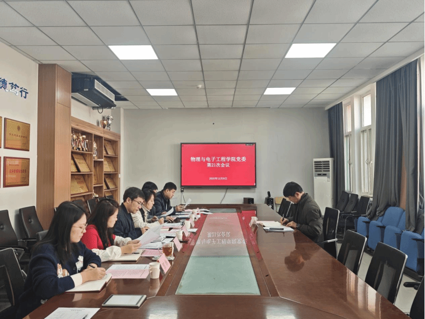 12月8日,物理与电子工程学院在2号实验楼B216召开第21次党委会,学校党委委员、统战部部长宋新刚列席会议并作指导发言。会议由学院党委书记臧葳主持,学院党委副书记周凯,副院长刘萌、王辉,团总支书记张凤云出席会议。