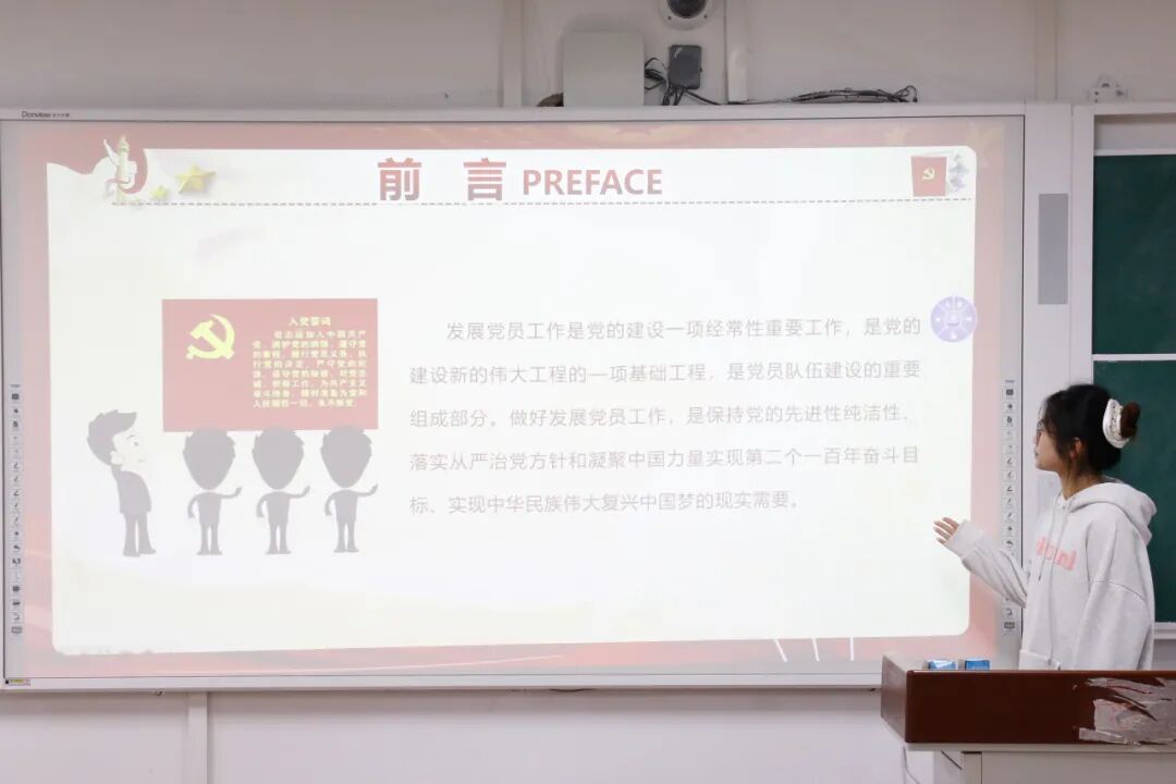 史梦圆从党员发展的政治逻辑与育人功能出发,系统阐释了发展党员工作的基本原则与程序要义。她以“申请—培养—考察—转正”为主线,重点解析了思想汇报的政治意义、政治审查的严肃要求、实践锻炼的教育价值以及预备期持续考察的育人作用。随后,她结合大学生实际,通过具体案例和常见问题,将严谨的党员发展程序转化为清晰易懂的指引,重点强调了思想汇报的真实性、政治审查的严肃性以及预备期持续学习与实践的重要性。在互动环节,她鼓励同学们不仅要追求组织上入党,更要做到思想上入党,主动加强理论学习,积极参与实践锻炼,自觉接受组织考验,时刻以党员标准严格要求自己。