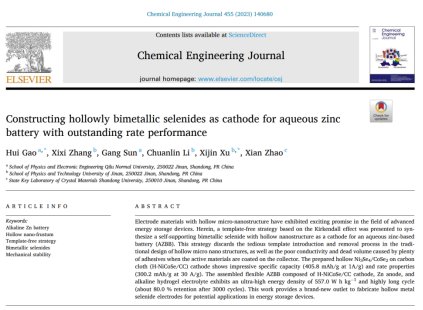 近日,我院凝聚态物理团队高慧副教授在国际知名期刊《Chemical Engineering Journal》(影响因子16.744, SCI一区)发表一篇名为《Constructing hollowly bimetallic selenides as cathode for aqueous zinc battery with outstanding rate performance》的学术论文。