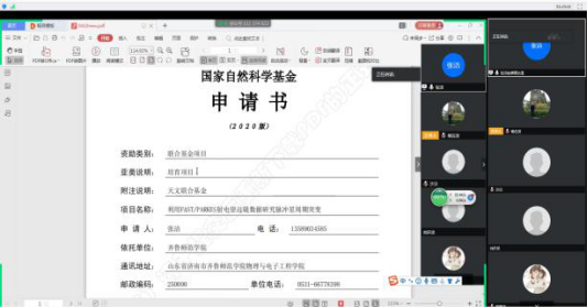 4月10日下午,学院采取线上腾讯会议方式进行国家自然科学基金项目申报指导论证会。学院邀请了中科院紫金山天文台科技处处长刘庆忠研究员、北京师范大学天文系张同杰教授、山东大学物理学院李伟峰教授、齐鲁师范学院科研处处长魏培海教授对我院10名教师申报的项目进行线上指导,学院20余名教师参加。会议由学院院长张洁主持。
