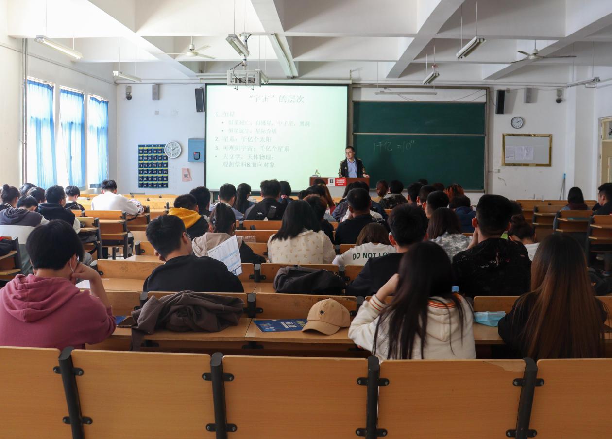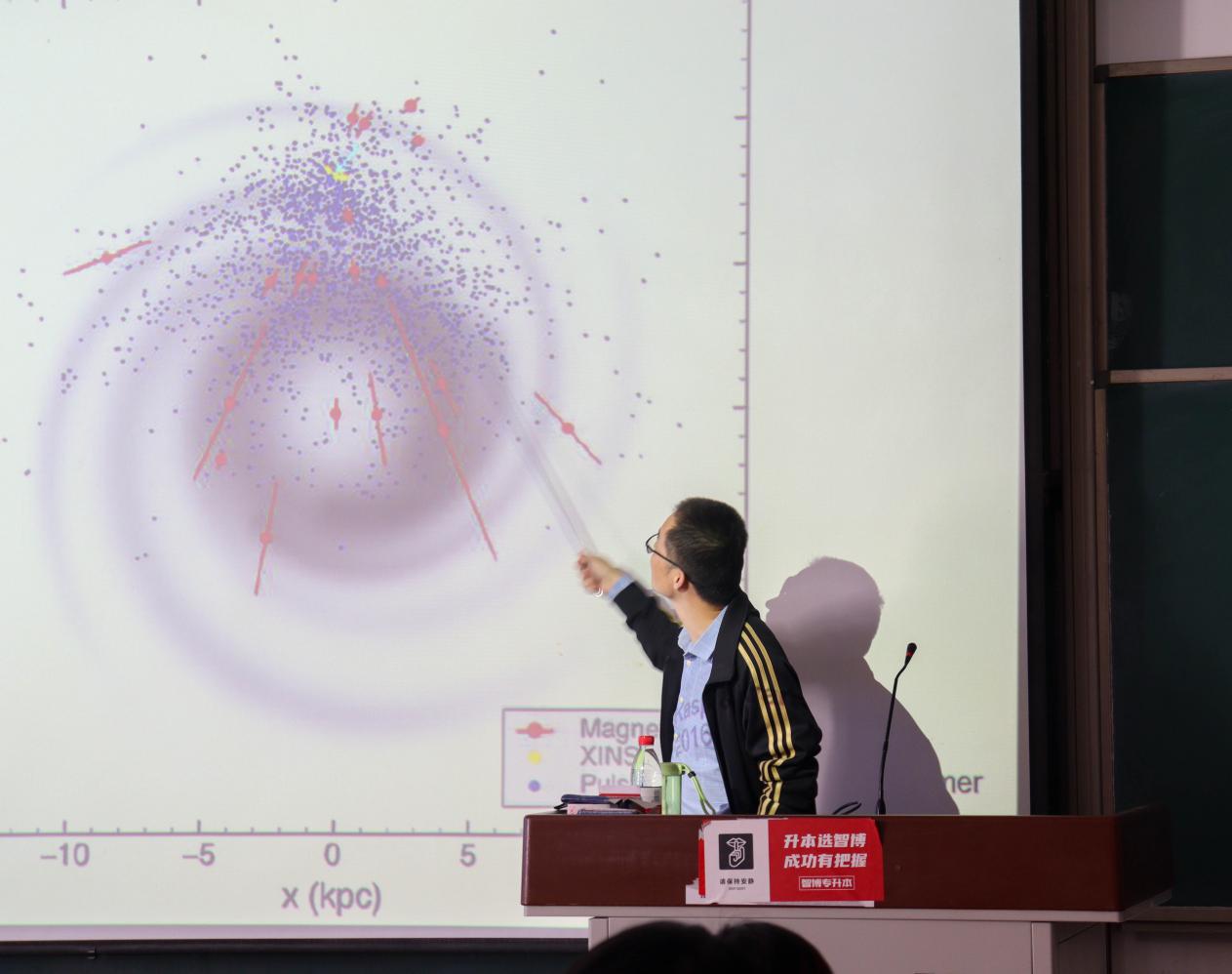 报告开始之前,由主持人刘老师向在座学生隆重地介绍了主讲教授仝号博士。仝号博士于2010年博士毕业于南京大学天文系,中国科学院高能物理研究所博士后,中国科学院新疆天文台副研究员,现任职广州大学教授,主要从事脉冲星和磁星方向的理论研究。天体物理作为物理学的一部分。报告开始,仝博士向在座同学提问了“多少天文学家获得过诺贝尔文学奖”等几个小问题,由此引出了本次报告的主题“奇妙的脉冲星”。老师围绕“什么是脉冲星,它为什么很奇妙”展开了本次报告。从脉冲星的历史到脉冲星的观测,再到脉冲星的应用,仝博士运用自己渊博的学科知识和非凡的物理学素养循循善诱,对问题进行了详细而又独到的阐述,深入浅出。报告中,同学们认真听讲,并随手记录报告内容,展现了物电学子对真知的渴望和热爱探索的优良风貌。报告接近尾声,仝博士带领大家对于本次报告学习的问题进行了复习,并耐心地解答了一些同学具体的疑惑。报告最后,主持人刘老师对本次报告进行了总结,表示本次报告表明了天体物理在大学物理中的重要性,使同学们对天体物理有了更深的理解,并对仝教授致以感谢。