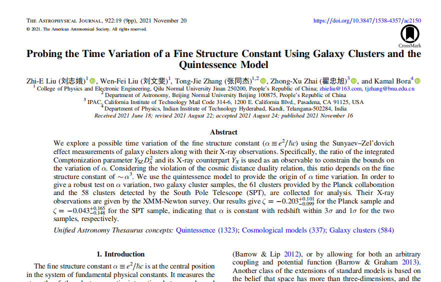 11月20日,齐鲁师范学院作为第一承担单位、我院副教授刘志娥作为第一作者和通讯作者完成的“Probing the Time Variation of a Fine Structure Constant Using Galaxy Clusters and the Quintessence Model”的论文,在天体物理权威期刊“The Astrophysical Journal ”上喜获发表,第二作者刘文斐也是我我院教师。这标志着我校天体物理学科研究水平逐步跻身国内前列。