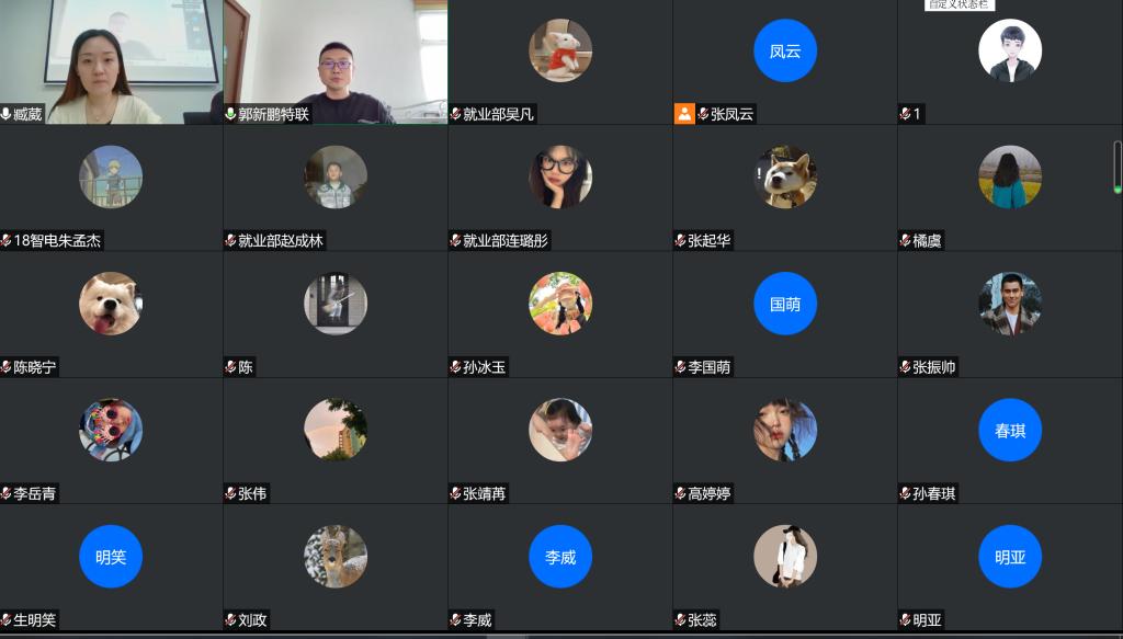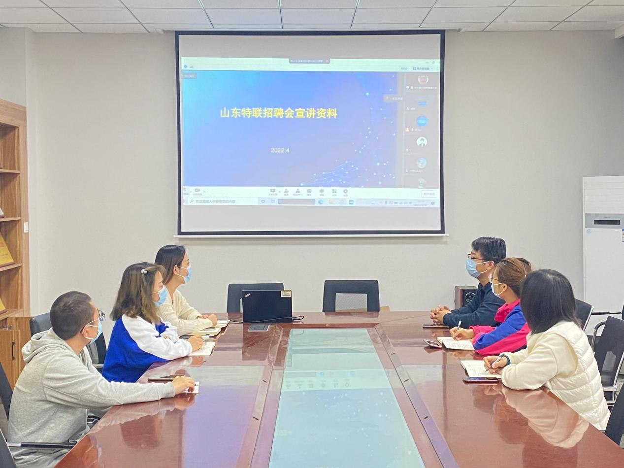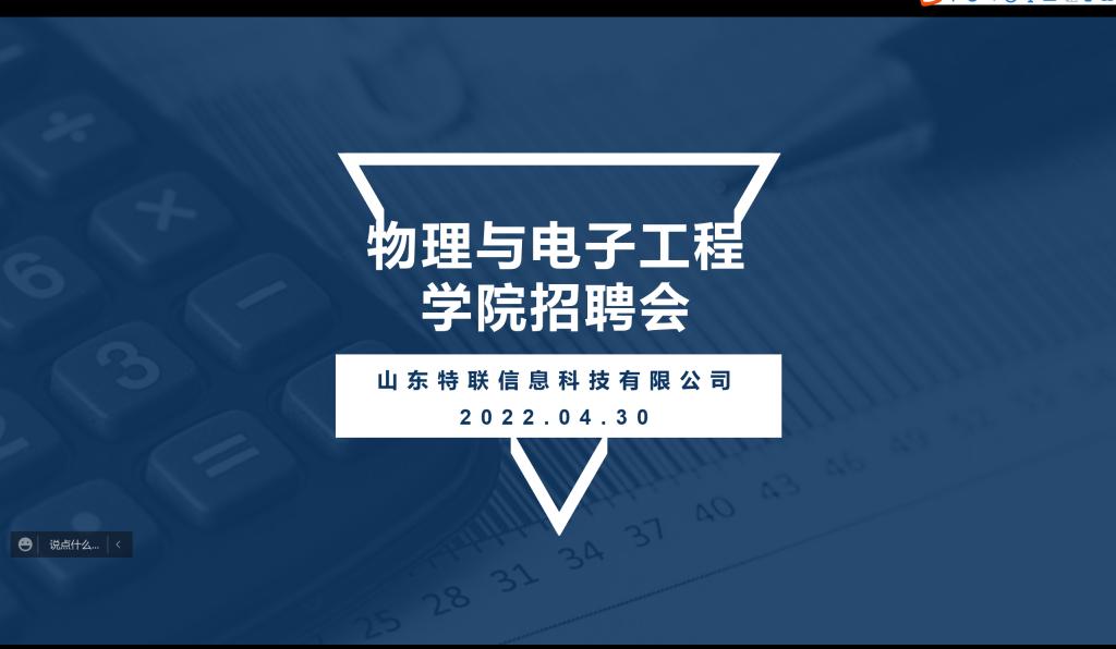 为搭建校企合作平台,拓宽毕业生就业渠道,促进产教融合与学生就业工作,提高毕业生的就业质量。4月30日上午,物理与电子工程学院于一号实验楼B216进行学院领导访企拓岗线上交流会,并组织企业宣讲及线上招聘会。会议由学院团总支书记李华主持,党委副书记臧葳代表学院领导与山东特联信息科技有限公司董事长郭新鹏进行深入交流,全体辅导员、2022届200余名毕业生参加此次会议。