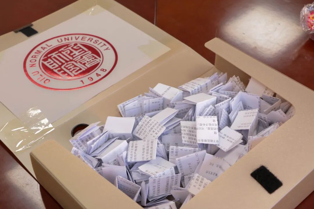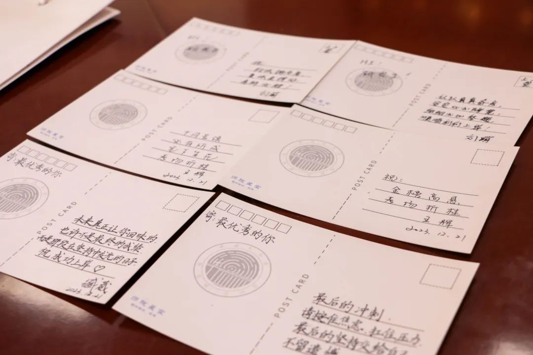 活动现场布置精美,为缓解考研学子紧张备考情绪,营造轻松愉悦舒适氛围,学院特意设计抽奖活动,不仅精心准备了充满美好寓意的“学院Logo考研福袋”“暖在研途”暖宝宝贴、“泰山石敢当”福满多、“一帆风顺”手工品、“不急不躁”精装本、“超越梦想”T恤衫和“金榜题名”文具袋等多类且能满足考研学子实际需求的爱心创意奖品,更有来自学院领导班子手写的祝福明信片。