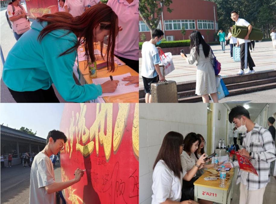 迎新的师生在迎新场地往来奔走、热情洋溢,两台人脸识别机器轮番协作,大大提高了报道效率,避免了人群聚集,减少了排队等待的时间;在报名签到处两侧,物电学院教师风采展、2021届考研光荣榜、鲜活的红色签名墙、手印墙等增强了新同学对学院的进一步了解,新同学们纷纷与红色签名板留影,并留下自己的手印,以此记录自己的开学瞬间;报到之后,老生带领新生们前往宿舍,搬运行李、讲解校园概况、引导新生入住等等.伴随着烈日,物电21级新生们开启了他们的大学生活
