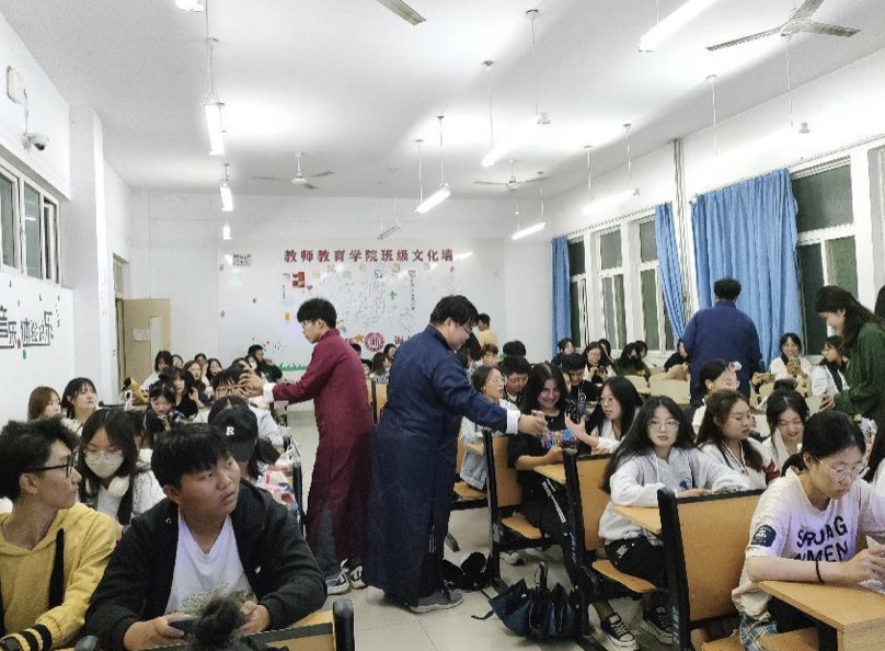 永乐社成立于2012年,是一个名副其实的老牌社团。社团以传播传统文化,展现语言艺术为宗旨,陪伴一代又一代的齐师学子度过快乐的春秋。宣讲会上,社团社长首先向同学们介绍永乐社的情况,随后成员们穿着相声大褂,笑容满满的拿着二维码邀请同学们加入永乐社并向大家表演了《我是歌手》、《口吐莲花》《学哑语》,以及贯口 《莽撞人》、《同仁堂》等。同学们被深深地吸引并不时鼓掌喝彩。