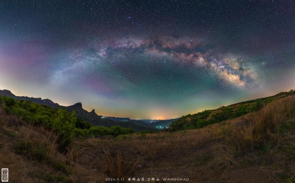 白天有沙尘影响,空气质量较差,但经过一天的大风之后,傍晚天气逐渐转好,适合观测。在爬山途中还看到了日照金山。进入天文黑夜,同学们先后幸运地遇到STARLINK“空中列车”,掠地火流星还有很多偶发流星,这些事件都足以证明同学们此行有足够好的天气和运气。虽然北方仍有光污染,但得益于白天沙尘的存在,夜晚的气溶胶和水汽很少,大气稳定度和通透度极好。半夜后已经可以清晰地肉眼看到银河大体结构,记录下了银河、气辉、极光的合影!(36.50°N,117.34°E)
