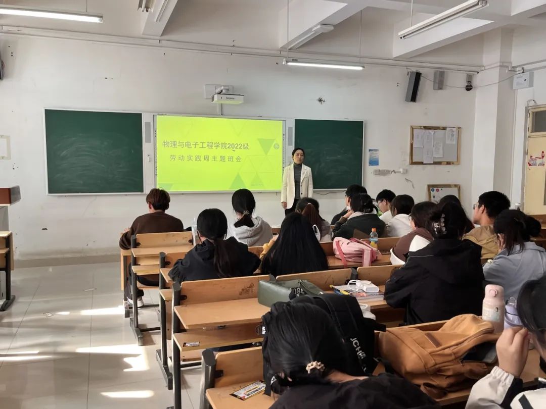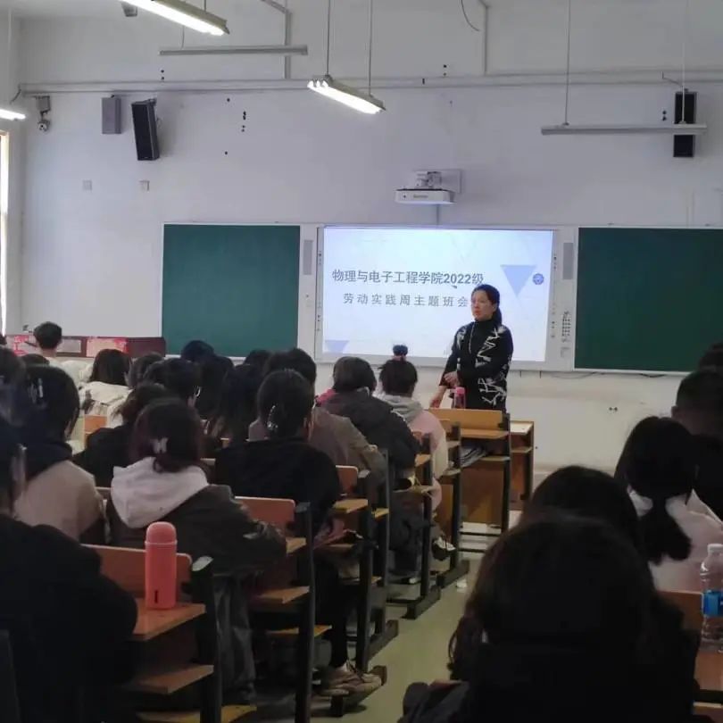 为践行劳育精神,展现新时代大学生劳动风采,我院于11月10日中午召开物理与电子工程学院2022级劳动实践周主题班会。会议宣布我院将于11月13日至11月19日开展为期一周的劳动实践活动,主张让青年投身劳动,热爱劳动,以劳动为荣,共创学院的良好育人环境。班会由2022级辅导员臧葳、梅茹主持,全体2022级学生参会。