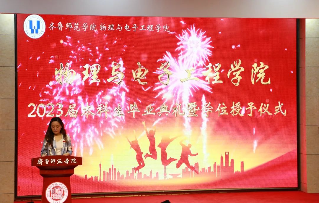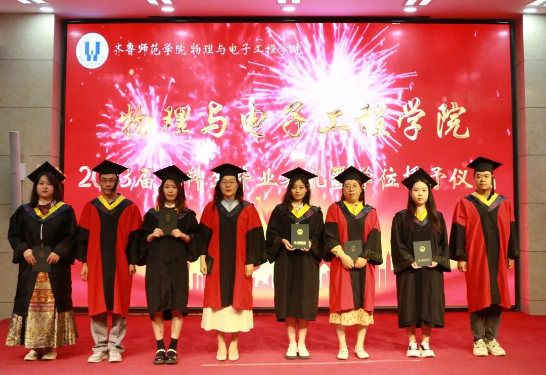 典礼伊始,我院院长张洁致辞,张洁对大家顺利完成学业表示祝贺,并回顾了同学们大学校园生活的点点滴滴,寄语2023届毕业生心中有梦,眼里有光;行而不辍,未来可期。张院长的话语重心长,希望同学们牢记这份祝福与期望,不要感怀离别的悲伤,要用青春去拥抱时代,将个人的小我融入时代的大我,永葆赤子之心,厚植国家情怀,砥砺时代担当!同学们掌声阵阵,纷纷表示定不负母校与时代的殷切期望与祝福,用青春年华奔赴时代之约!接着陈宝金致辞并宣读2023届优秀毕业生名单,陈宝金饱含深情寄语2023届毕业生爱校荣校,并常回母校看望,鼓励同学们青年兴则国家兴,青年强则国家强,日日行不怕千万里,时时做不惧千万事,努力成为敢于有梦、勇于追梦、勤于圆梦的新时代青年。学院教师代表袁晓娟寄语同学们,未来的人生路上有更大的舞台,将面临更多的挑战和更多的人生抉择,但是“青春”的心态不应老去,“年轻”的勇气不应丧失,希望同学们永葆一颗年轻的心,让“青春”常驻心间。同学们应努力成为奋战在祖国建设主战场上的主力军,以青春之我,勇担时代之责。2023届毕业生代表王敏在发言中回忆了这四年来在母校度过的点点滴滴,深切表达了对封校三年的遗憾与欢乐,对同学们之间不懈努力与坚持的佩服,对老师们殷切教导的感谢。最后对母校、老师、同学们送上美好的祝愿:“祝愿老师身体健康,阖家欢乐,桃李满园,祝愿同学们扬帆起航,前程似锦,祝愿物理与电子工程学院蒸蒸日上,再创辉煌,祝愿师院积历史之厚运,再谱华章!”学位授予仪式上,学位评定委员会教师代表张洁、刘萌、王辉、刘志娥为2023届毕业生代表授予学位,拨穗正冠,握手致意,毕业生们手捧学位证与校领导合影留念,帽穗从右到左,拨过大学四年的点滴时光,同学们在祝福和掌声中掀开人生新的篇章。
