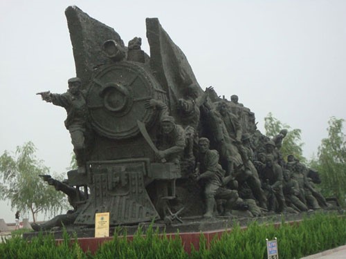 最令队员们感到震撼的是铁道游击队纪念碑:碑体正面为竖起路轨的造型,栩栩如生的游击队战士们持枪冲杀的铸铜人物塑像矗立于纪念碑顶,体现了游击队员们活跃在铁路线上,浴血奋战的精神;纪念碑左侧是自上而下贯穿整个碑体的50根枕木,象征中国抗日战争胜利50周年。碑体中央镶嵌着由原国家主席杨尚昆亲笔题写的“铁道游击队纪念碑”8个金箔帖面大字,底座正面篆刻碑文,碑底座两侧的花岗岩人物浮雕,再现游击队员英勇杀敌的战斗场面,碑前及两侧八级台阶,代表了8年全国抗战。