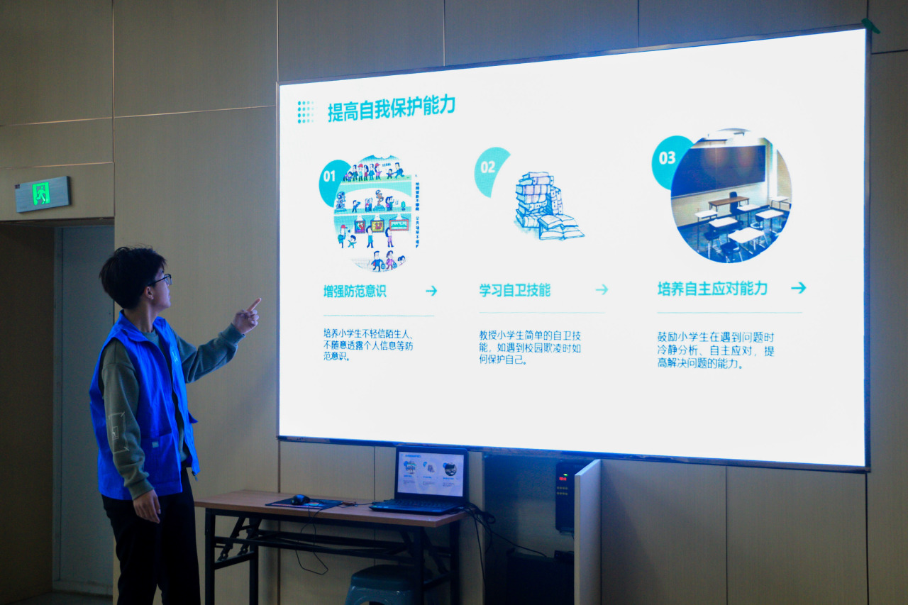 在实践活动过程中,成员们用通俗易懂的语言讲述知识,与学生们进行面对面交流,解答他们的疑问,并以提问、模拟情景、做小游戏等方式与学生们互动,充分调动他们的积极性,使其踊跃参与,确保在和谐、欢乐的课堂氛围中,将知识和安全意识灌输到学生们的脑海中。