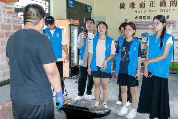 在澜头古村非遗研学基地,队员们在非遗传承人贾子龙带领下,领略传统纹样与现代美学的融合设计,深入理解文创产品兼具实用与美学的文化价值理念。在郝氏铁艺工坊,队员们开启实时直播,与线上网友共同观摩工匠亓振演示选料、烧锻、淬火等核心工序,从其精准控温与力道掌控过程中体悟"以科学精神传承匠艺"的核心理念,并由亓振梳理铁艺演进脉络、解析材料建模与工艺数据化的创新成果。通过实地调研,队员们深刻认识到数字化技术正成为非遗活态传承的关键支撑,科技赋能正使传统工艺在当代焕发新生。