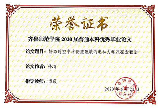 除了教学工作,她还承担了毕业论文和实习指导工作。学生毕业论文的选题大多出自教学和科研工作中的所思所想,在课堂教学中无法深入展开的课题,一篇本科毕业论文刚好能加以阐述。论文选题如《论菲涅耳公式和半波损失现象》、《光速不变原理及其数学推论》、《静态时空中洛伦兹破缺的电动力学及霍金辐射》等。悉心指导论文的写作,注重论文的创新性,严格把关论文的各个环节,使学生的毕业论文得以顺利完成。2019年和2020年连续两年指导学生获得校级优秀毕业论文。再者,她还参与指导学生讲课比赛,从课件制作到讲稿设计,她都给予积极的意见。2023年指导学生获得全国第十四届格致杯物理师范生教学技能展示二等奖、山东省师范类高校学生从业技能大赛三等奖。