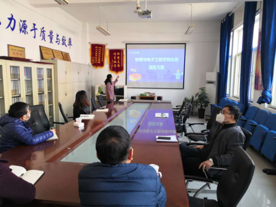 前期,按照学校疫情防控工作要求,学院以《齐鲁师范学院突发新冠肺炎疫情应急处置办法》(齐鲁师院疫控字〔2020〕9号)为依据,制定了《物理与电子工程学院突发新冠疫情应急处置办法》(草)《物理与电子工程学院应急演练方案》(草),会议对两个方案进行了审议,对方案中的工作流程进行了细化完善
