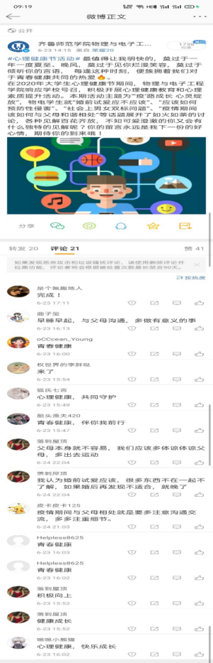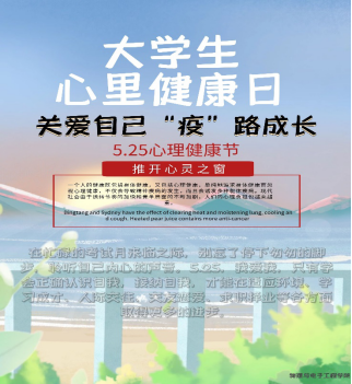 为了帮助学生正确认识自我,关注自我心理健康,不断提高心理素质,完善人格,全面提升广大师生的心理健康水平。我院在五月份开展了以“关爱自己 ‘疫’路成长”为主题的525心理健康节活动。在活动初期我们通过学院官方微博进行心理健康节系列活动预热,以及活动海报的制作、文案策划,加强宣传,吸引学生关注。