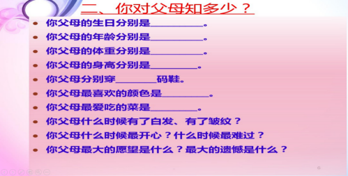 疫情让我们有了更多的时间陪伴父母,掌握一定的方式方法,与父母有效沟通,更加增进感情。理解父母,尊重父母,只要你作出努力,“代沟”也是可以逾越的! 在对父母知多少的调查问卷活动中,发现的我们大多数人对自己父母还是十分了解,但是日常生活中不常发现的往往是我们忽略的。在此之后,对我们同学们的一个感想是要多注重生活细节,发现与父母相处的点点滴滴。应该如何预防性侵害