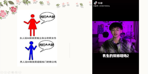 男女双标这个问题,从古至今就有,而且大家似乎也习惯了,通过开活动,与大家互动,我发现大家并没有什么激烈的讨论,争执,许多男生很坦然的觉得照顾女生应该的,认为女生结婚之后会更辛苦,应该被照顾体谅,女生三观也很正,并没有像网络什么所说的太双标。虽然男生可以做的事女生几乎都可以做,女生做的事男生也几乎都可以做,但是现实生活中男女双方都是相互体谅相互宽容,班级同学三观都蛮正,通过这次班会,同学们会更加注意细节,改变过去一些错误观点