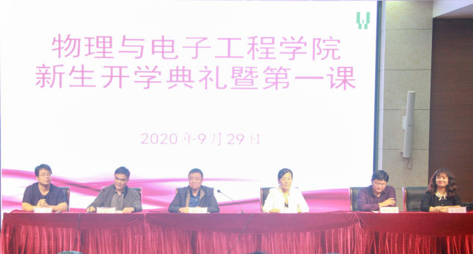 9月29日下午,物理与电子工程学院新生开学典礼暨第一课在学术报告厅举行。学院领导、教师代表、全体辅导员和2020级全体新生参加。大会由学院团总书记李华主持。