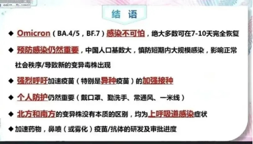 对于近期网上“北方毒株比南方凶”的说法,钟南山院士谈到,北京流行的变异株以BF.7为主,广州流行的变异株以BA.5.2为主,本质上毒株不存在区别。钟南山院士表示,在北方,潜伏期进一步缩短,患者在感染次日即出现传染性。大部分人在感染后没有很明显的症状,即无症状感染者。部分人出现咽干、咽痛、干咳、头痛、发热等症状,即为轻型患者。他指出,发热温度高、全身疼痛让患者很不舒服,但这与医学上的重症轻症是两回事,并不是说疼痛得厉害就是重症。随着疫情防控十条优化措施的出台,我国疫情防控面临着新形势新任务。作为个人健康的第一责任人,每个人都有责任保护好自己和家人。这其中,就包含尽可能全面、客观和理性地认识病毒。最后钟南山院士再一次强调,奥密克戎感染并不可怕,绝大多数7-10天会完全恢复正常,但预防仍然很重要,并呼吁同学们加强疫苗的接种以及个人防护。