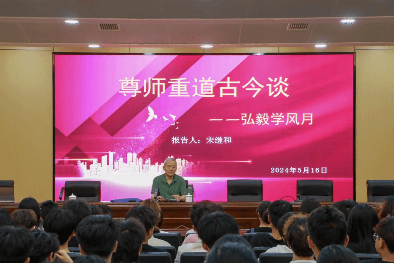 会议伊始,宋继和以“尊师重道”为切入点,深入阐释“凡学之道,严师为难。师严然后道尊,道尊然后民知敬学”的内涵,并从师与尊师、道与重道两部分进行展开讲解。在从师与尊师立意中,宋继和用为什么尊师重道开篇立意,从“师”的文字演化及其意义、尊师的家学渊源等方面展开回答,并通过自身求学时的经历和列举百家争鸣、《师说》、杨时游酢、程门立雪等体现师生情的经典名人故事,教导学生如何尊敬老师,跟从老师学道,以己之学兼济天下。