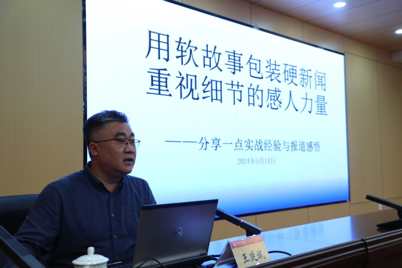 会议伊始,王延斌对听众的到来表示热烈欢迎,以幽默诙谐的谈话与学生进行互动,活跃现场氛围。后引出以“用软故事包装硬新闻,重视细节的感人力量”的主题,结合自身丰富的新闻宣传实践经验,从新闻传播的基础理论、实操技巧、案例解析以及未来趋势等方面展开,深入阐释了新闻的采写、编辑形式与技巧,强调了新媒体环境下的新闻传播策略。同时,王延斌强调新闻拍摄“张力”,拍摄新闻图片要讲究张力、动感、故事,注意好图片既要抓拍,更要策划,随后从新闻的内容与图片两部分全面系统地讲解了新闻的撰写的要点与重点。