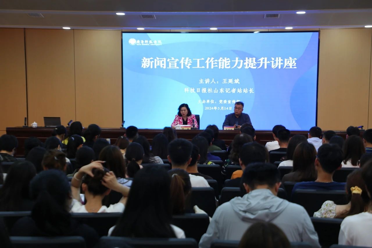 为提高我校新闻宣传工作者在新闻传播领域的专业技能和实践操作能力,促进各学院新闻宣传工作的发展。5月14日,学校于二号教学楼第二报告厅组织开展了专题为“新闻宣传工作能力提升”的讲座,该讲座由科技日报社山东话记者站站长——王延斌主讲,我院积极组织全体网络宣传人员参加本次学习培训。讲座上王延斌在深入浅出地向学生们介绍了新闻宣传的基础理论、技巧以及实践方法。讲座现场气氛热烈,学生们积极参与互动,对于如何在实践中运用所学知识表现出极高的兴趣。