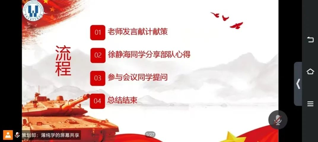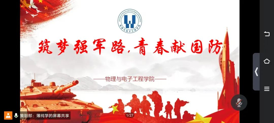 为深入贯彻习近平强军思想,积极响应国家号召,加强国防和军队现代化建设,值此中国人民解放军建军97周年之际,我院于7月31日晚上18:00举行了线上“筑梦强军路,青春献国防”——庆祝八一建军节征兵主题会议。本次会议邀请了团总支书记张凤云,辅导员吕伟皓、徐爱林,退役复学军人徐镜海同学以及若干有意向参军的同学参会,由薄纯学同学主持会。