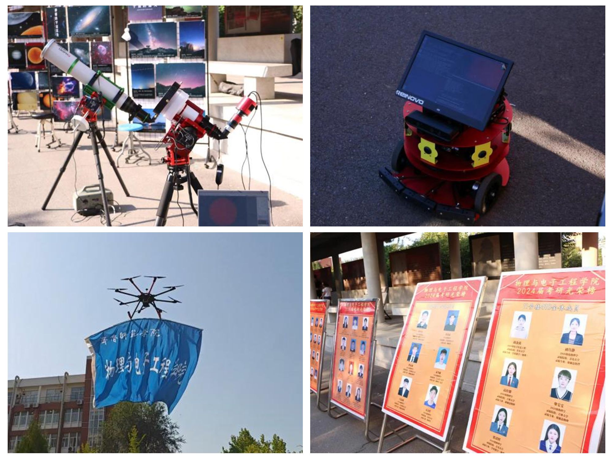 学院将专业知识与教学成果搬出了课堂,充分发挥学科优势,将科研成果投身运用于现实场景。由师生自主研发的小型智能机器人、无人机等出现在迎新现场,智能机器人小小的身躯“行走”在新生当中,引得一众注目,无人机则带着院旗飘扬在师院上空,在现场的欢呼声与注视中旋转飞行,瞬间吸引了所有人的注意。奎虚天文社也架起了天文望远镜邀请各位新生和家长现场观测天空,并向新生们展示观测到的天文景观,讲解相关天文知识。同时,学院教师风采展、考研光荣榜等展板吸引了众多新生及家长驻足观看。通过这些板块,不仅展示了学院的科研教学水平,还极大地增强了新生对学院的认同感和归属感。