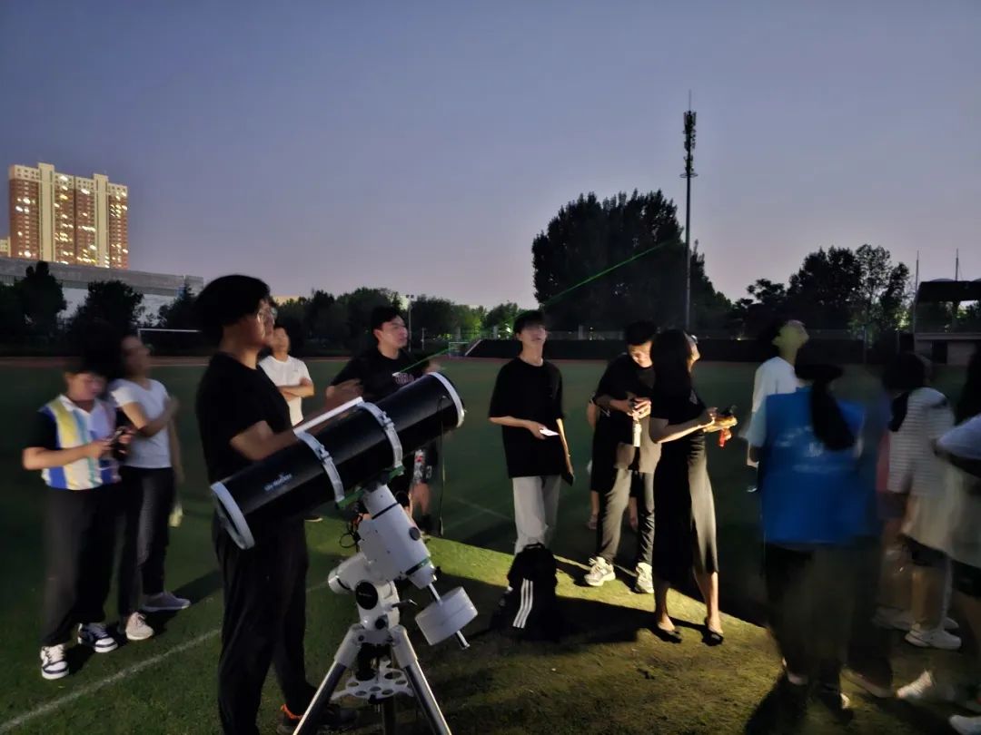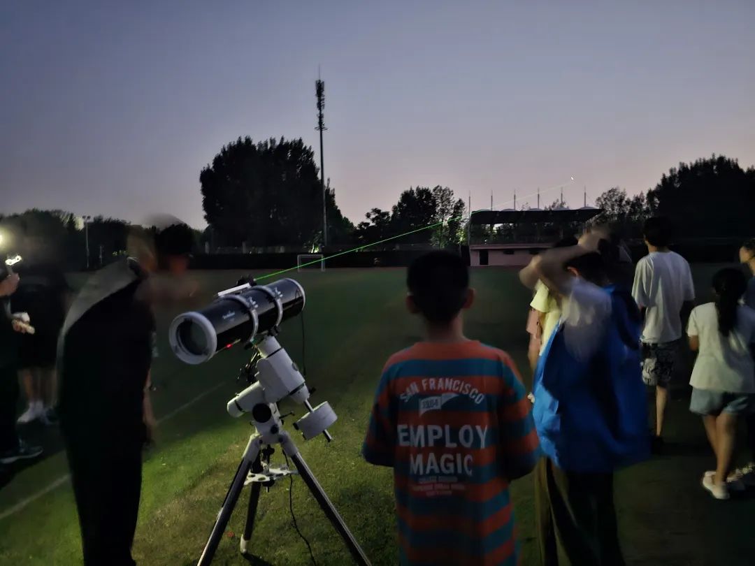 夜幕笼罩,道通实验学校的操场上,同学们已跃跃欲试,迫不及待着一睹星河“芳容”,在任逸博士的的指导下,实践团中天文学专业同学完成了望远镜的校准与调试工作,做好了观测星空的准备。