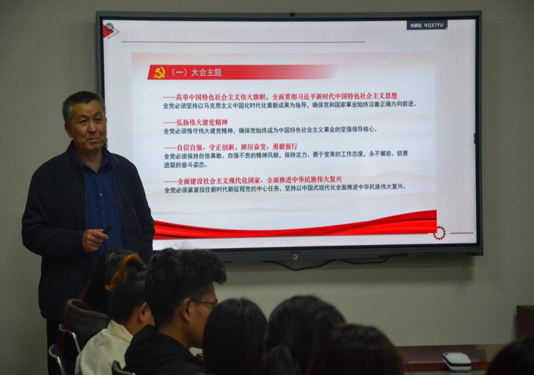 陈宝金简要介绍了中国共产党第二十次全国代表大会主要议程以及大会主题,并指出二十大会议的召开对党和国家事业继往开来,对团结和激励全党全国各族人民全面建设社会主义现代化国家、全面推进中华民族伟大复兴具有重大意义。陈宝金围绕“牢牢把握过去五年工作和新时代十年伟大变革的重大意义”、“牢牢把握习近平新时代中国特色社会主义思想的世界观和方法论”、“牢牢把握以中国式现代化推进中华民族伟大复兴的使命任务”、“牢牢把握以伟大自我革命引领伟大社会革命的重要要求”、“牢牢把握团结奋斗的时代要求”等五个方面谈了学习党的二十大精神的体会,强调同学们应当深刻领悟“两个确立”的决定性意义,坚决做到“两个维护”,全面贯彻习近平新时代中国特色社会主义思想。坚定自我,保持自信,树立远大理想,矢志报国,奋力谱写全面建设社会主义现代化强国的崭新篇章。