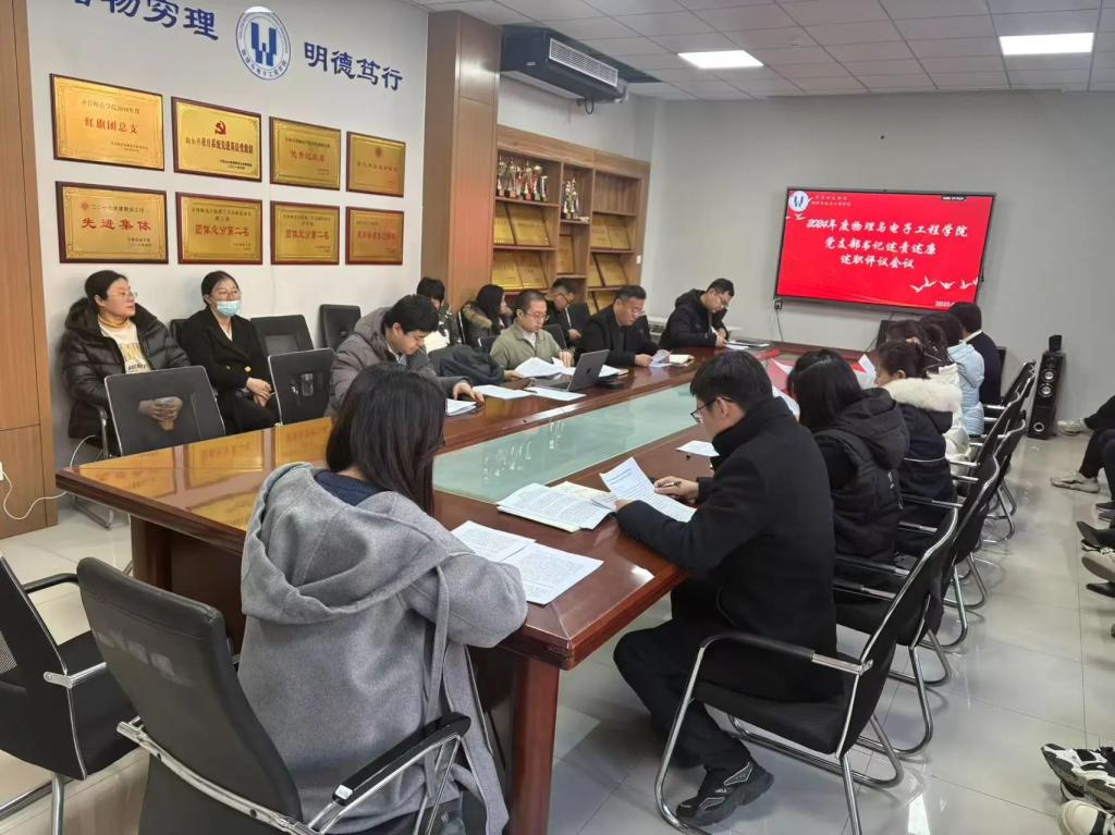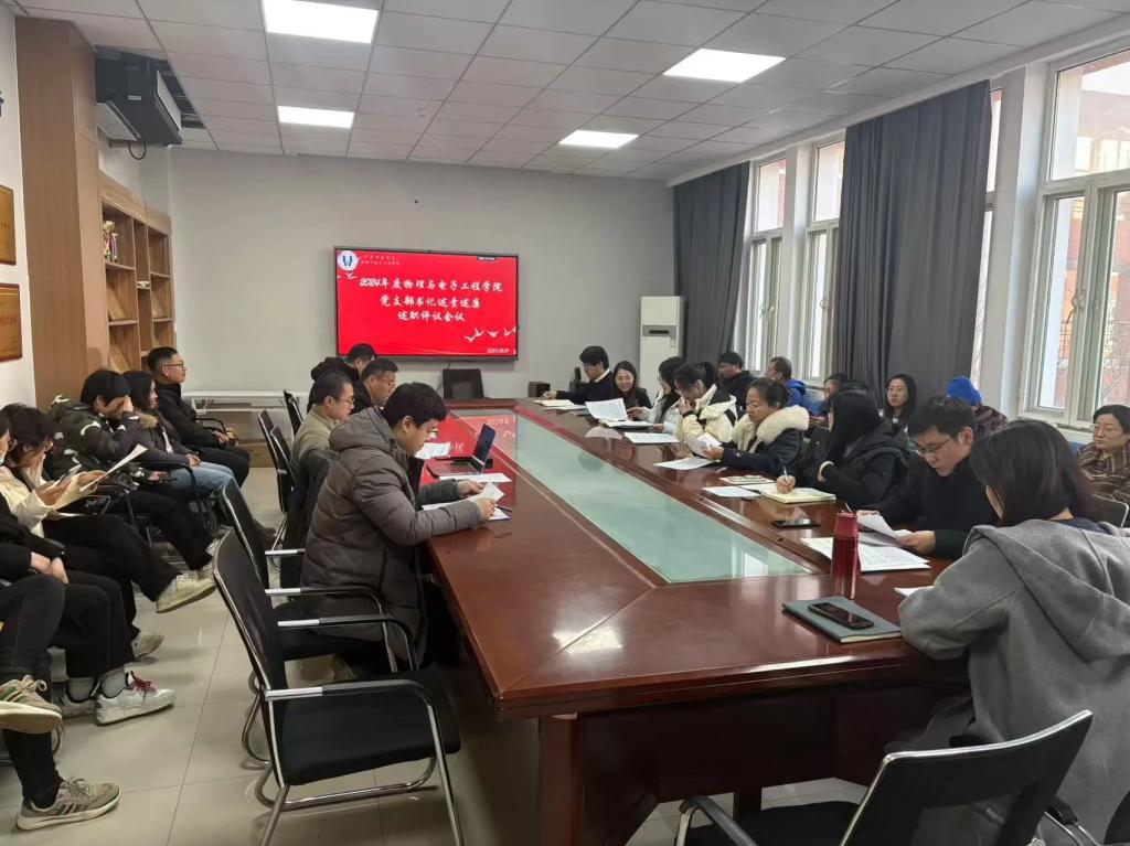 为认真贯彻落实习近平总书记关于党的建设的重要思想,深入学习贯彻党的二十届三中全会精神和党中央关于整治形式主义为基层减负要求,进一步压紧压实各级党组织书记抓基层党建工作第一责任人责任,推动全面从严治党向基层延伸,提升党建工作质量,2025年1月16日下午,齐鲁师范学院物理与电子工程学院在会议室召开了党支部书记述责述廉述职评议会议,学院党委书记臧葳,学院院长、副书记张洁,学院副院长、党委宣传委员刘萌,学院副院长、党委纪检委员王辉,学院副院长、教师第二党支部书记任逸,学院教师第一党支部书记杨在发,学院教师第三党支部书记赵邦宇,学院团总支书记、学生第二党支部书记张凤云,学院学生第一党支部书记吕伟皓及各支部党员代表参加了此次会议。会议由学院党委副书记周凯主持。