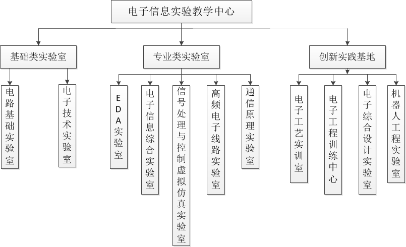 电子信息实验教学中心自成立以来,在学校、学院的大力支持下不断发展壮大,建设了基础类实验室、专业类实验室和创新实践基地,组织架构如图所示。