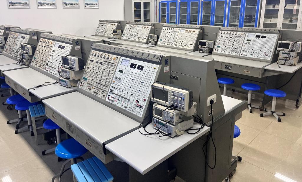 电子技术实验室隶属于电子信息实验教学中心,主要承担模拟电子技术、数字电子技术课程实验部分的教学,通过实验教学使学生加深对理论课程的理解,激发学习兴趣,进而提高学生的工程实践、技术应用、设计开发和创新能力。实验室使用面积约70平方米,实验设备16台(套),主要设备有DZX-3型电子技术综合实验台、TPE-A4型模拟综合实验箱、TPE-D6型数字电路实验箱、YB1602函数信号发生器、SDG1050函数信号发生器、SDS-1102A型双踪示波器等。可开设模拟电子技术和数字电子技术基础型、设计型、综合型实验项目51个。