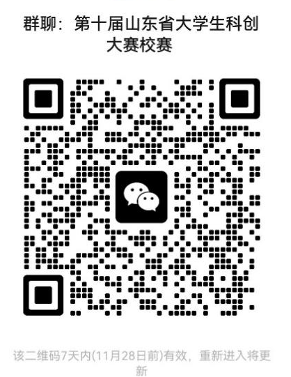 为方便沟通交流和信息发布,校赛组委会专门建立“第十届山东省大学生科创大赛校赛”微信工作群,请各学院确定1-2名大赛工作联系人于11月23日(星期四)12:00前扫码入群,备注:学院+姓名。