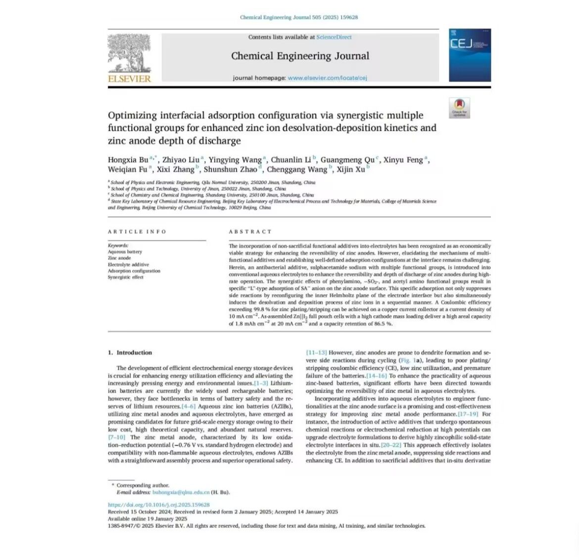 步红霞指导冯新瑜发表论文《Optimizing interfacial adsorption configuration via synergistic multiple functional groups for enhanced zinc ion desolvation-deposition kinetics and zinc anode depth of discharge》