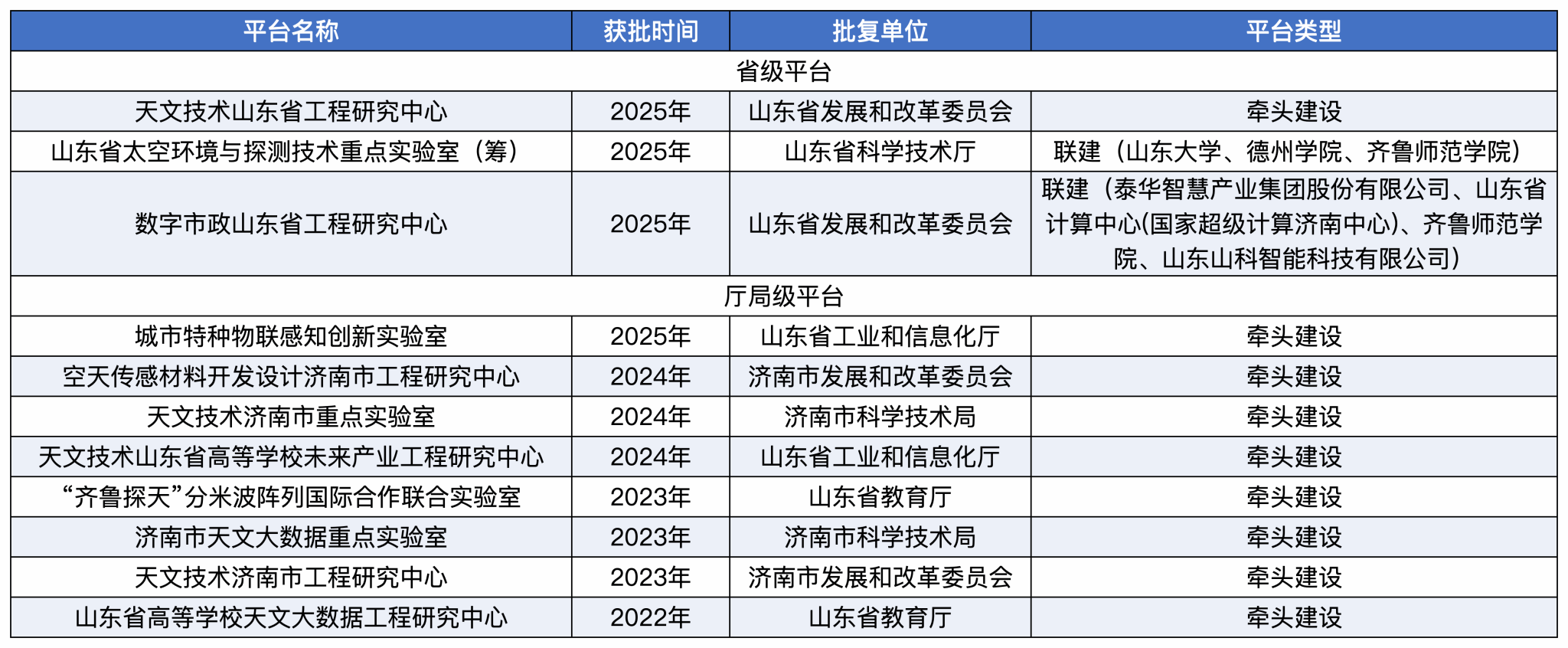 依托强大的团队实力,学院在科研平台建设上取得了显著成效,先后获批建设天文技术山东省工程研究中心、共建山东省太空环境与探测技术重点实验室(筹)、数字市政山东省工程研究中心等3个省级平台,山东省城市特种物联感知创新实验室、济南市天文技术重点实验室、“齐鲁探天”分米波阵列国际合作联合实验室等厅级科研创新平台8个,为科学研究和人才培养提供了优越的条件。